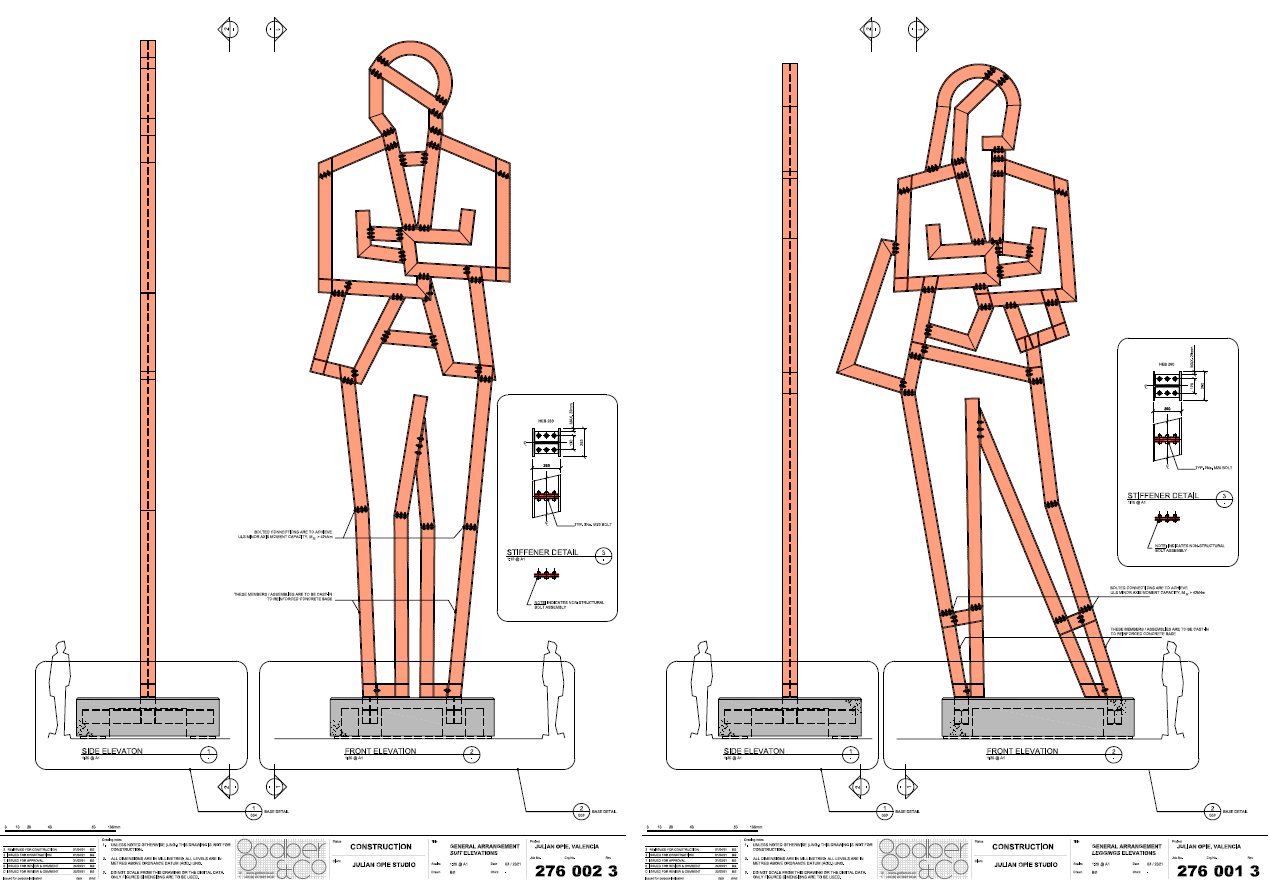 We have provided structural engineering design services to Julian Opie‘s studio. We did the structural engineering design for these two 12 metre tall figures, Suit and Leggings, which sat on Plaza del Colegio del Patriarco, Valencia. We worked with fabricators Flysteel Metallic Structures, in Porto to deliver this project for Fundacion Hortensia Herrero as part of a major exhibition of Julian’s recent work. Both Suit and Leggings have since been relocated to a very different setting in the Spanish countryside.